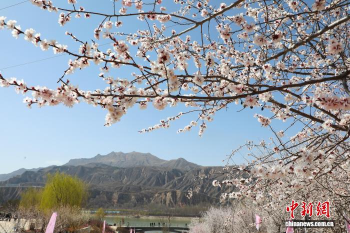 3月31日,青海化隆,黄河岸畔开放的杏花。化隆县素有“9直黄河化隆秀”的佳誉,黄河道经县域168千米,气象和气干润,每一年清朗节先后,成片杏花竞相开放,城家间1片生气盎然。中新社记者 马铭行 摄